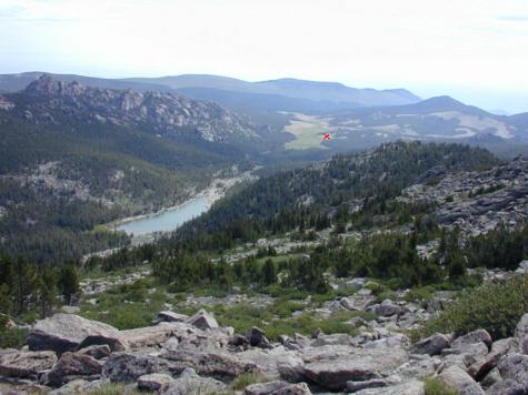 Looking back east to Dickinson Park trailhead (red-x) and Funnel Lake.