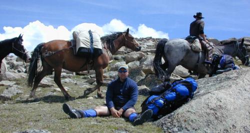 Friday: Second cousin John Hooker traveled by plane from O'Fallon, MO. Tim Lohrmann drove from Warrenton, MO (just up the road from Dutzow). After sorting through our gear, we did some grocery shopping in Casper, then headed for Lander.We arrived at the trailhead, Dickinson Park, at sunset. Before retiring to our tents pitched amongst the pines, Tim chased a herd of about 50 horses, all of whom had cow bells around their necks, from the surrounding meadow.