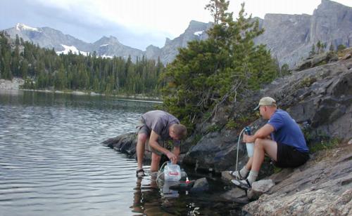 Pumping water at Valentine Lake for our supper: spaghetti and red sauce.