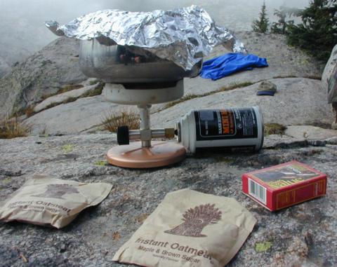 Two packs of oatmeal, pack of raisins, granola bar, and coffee. Purina for other.