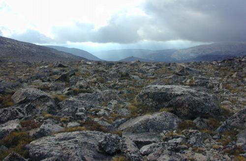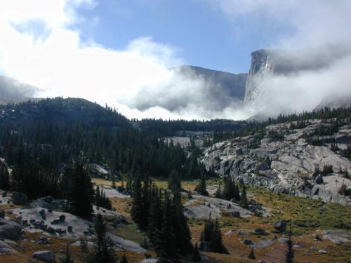 Sunday: What a difference a day can make. After returning from the lakes yesterday afternoon my feet were soaked as were my pants. It was still raining, I was getting cold, so I ended up crawling into my sleeping bag at 6:15 p.m. I wished I had brought a book, instead settled for some map reading and probably fell asleep within the hour.It quit raining finally, maybe by midnight. When I emerged from the tent there was not a cloud in sight. However there was fog in the valley below which started to work its way up. I dried all my gear out on the rocks and by 11:30 a.m. was ready to go back up to the Lost Twin Lakes to introduce myself to the fish.