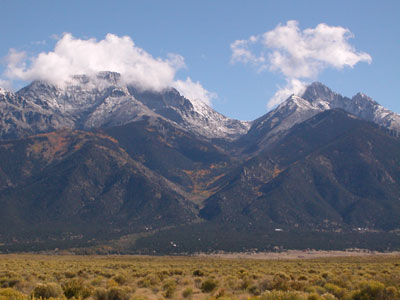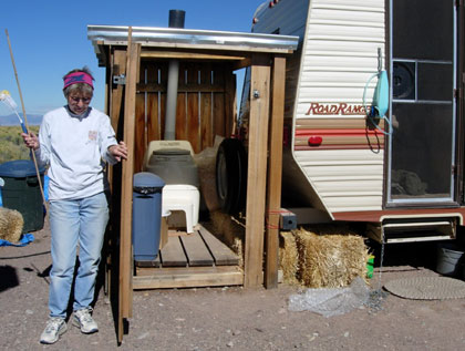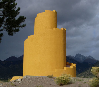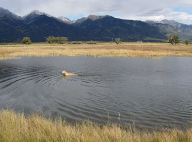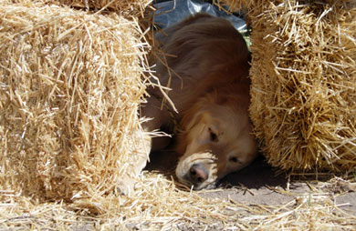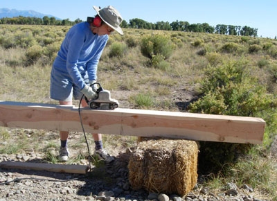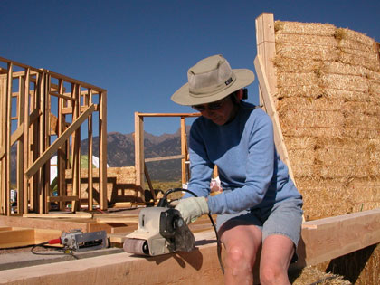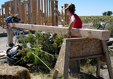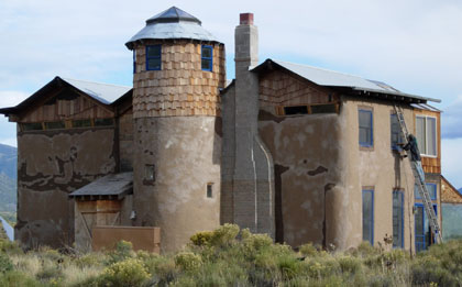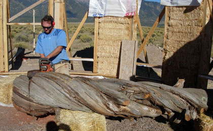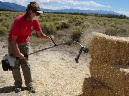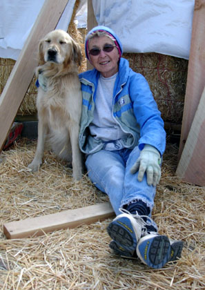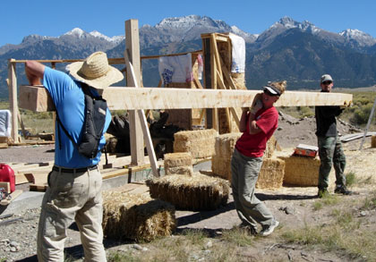 Squaring up bales with a weed-wacker. Cody & treat lady. Dusting of snow on the peaks. We find some water near Ryan's lot. A local straw bale castle. A nearby Ziggurat.